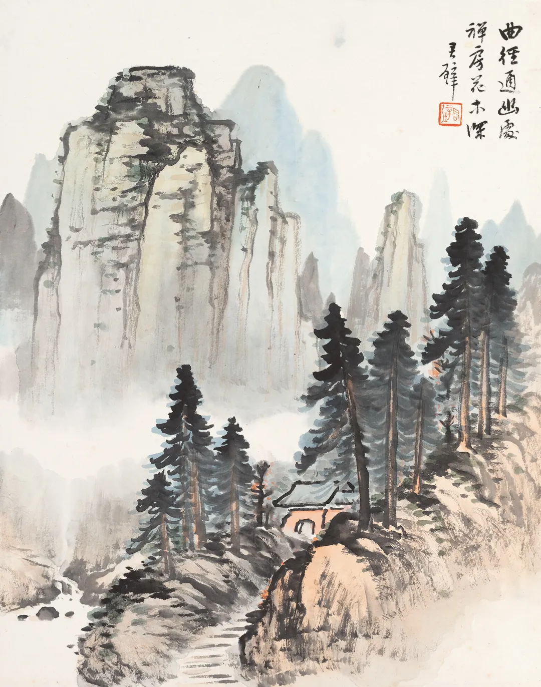 曲尽通幽处,禅房花木深:引用自常建的诗句,画面可能描绘了曲折小径通向幽静的禅房,周围花木繁茂,营造出一种宁静致远的氛围。